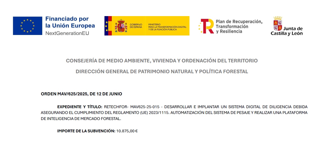 El proyecto, identificado como RETECHFOR- MAV625-25-015, tiene un objetivo claro: desarrollar e implantar un sistema digital de diligencia debida que garantice el cumplimiento del Reglamento (UE) 2023/1115, una normativa clave para asegurar la trazabilidad y sostenibilidad de los productos forestales en el mercado europeo.