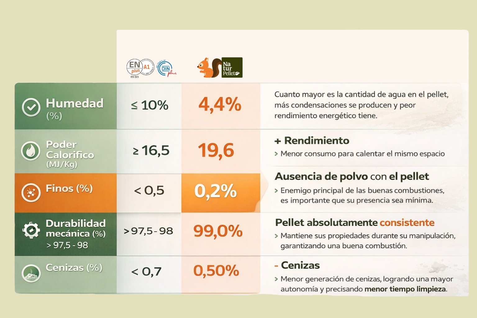 Partiendo de la alta calidad de la materia prima utilizada, la asepsia procurada durante su manipulación y el proceso tecnológico instalado, que permite el control automático continuo de todas y cada una de las variables, se consigue un pellet cuyas características cumplen ampliamente los estándares fijados por la norma EN-PLUS-A1. La formación se lleva a cabo con la única aplicación de calor, comprimiendo las micropartículas mediante rodillos y forzando su paso por las matrices granuladoras, en ausencia total de cualquier aditivo químico o colas aglutinantes. Energía limpia y 100 % natural.